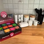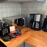 De woning heeft een eetgedeelte met een waterkoker, een koelkast en een oven.
